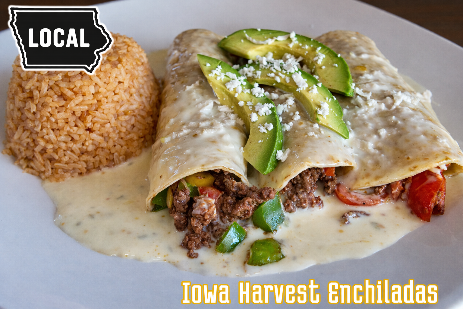 Iowa Harvest Enchiladas Three enchiladas filled with locally sourced Ory Brothers Beef (Earlham Iowa) sauteed bell peppers and cherry tomatoes, topped with warm queso sauce and avocado served with rice. 16.95