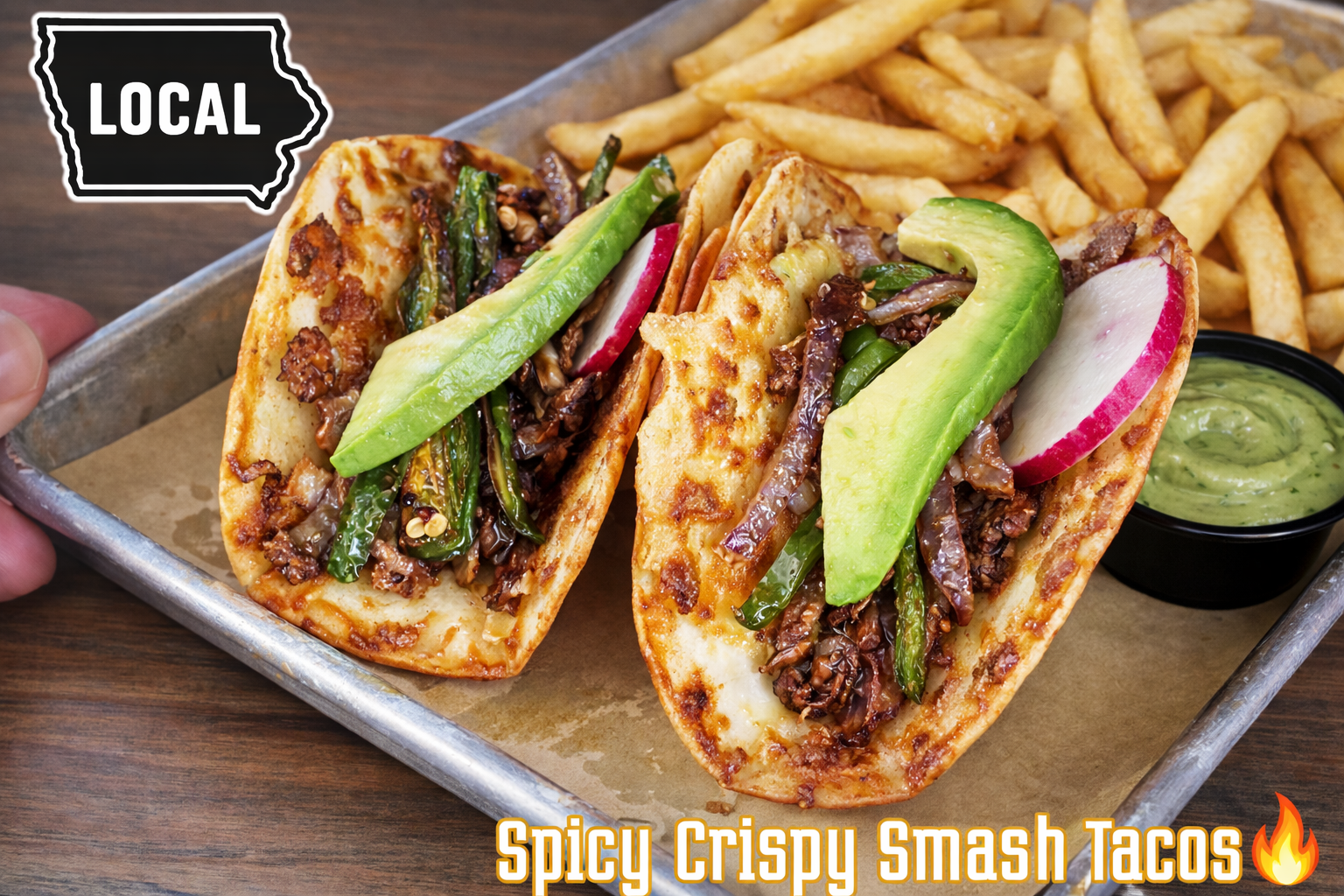 Two smash tacos made with locally sourced Ory Brothers Beef (Earlham Iowa) and melted cheese smashed onto a tortilla and cooked until crispy, topped with fried onions, jalapenos, avocado and sliced radish served with French fries. 16.95