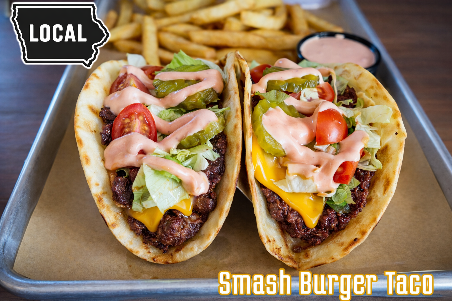 two smash tacos made with locally sourced Ory Brothers Beef (Earlham Iowa) ground beef smashed and cooked to order, melted cheddar cheese, lettuce, onion, tomato, pickles, and burger sauce served with French fries. 15.95